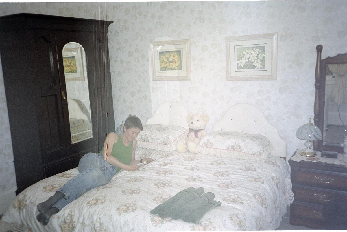 Wir hatten ein großes Doppelbett mit einer rosa Tagesdecke, die von Spitze nur so strotze.