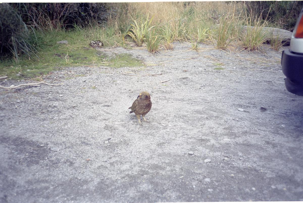 Der Kea ist ein rabengroßer Vogel mit einem Hakenschnabel. Der Vogel ist recht keck, hat nur wenig Scheu vor Menschen und taucht immer in kleinen Gruppen auf.